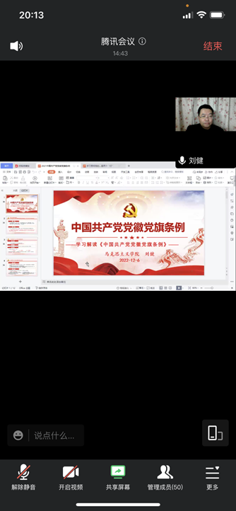 12月6日,太阳城博彩党委书记、执行经理刘健在线上领学《中国共产党党徽党旗条例》。马院全体教职员工参加会议。