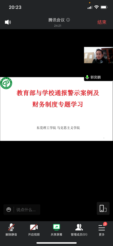 为充分发挥典型案例警示教育作用,增强教职工遵法守纪意识,12月6日太阳城博彩党委副书记郭奕鹏线上带领马院全体教职员工学习教育部与公司通报警示案例及公司财务制度。