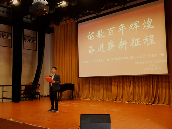 本次活动以百年党史为专题,选取松山湖、南泥湾为地理背景,通过情景剧、合唱等形式展示课程学习成果,弘扬创新奋斗精神。第一个节目是2021级音乐教育一、二班的情景剧表演《创新者》。同学们通过歌舞的形式演绎了松山湖二十年的发展历程。同学们用优美的歌声、欢快的舞蹈展现出松山湖迈向高质量发展的无限活力。第二个节目是2021级音乐教育二班、2021级小学教育一班带来的《南泥湾》。节目以演唱、诗文朗诵的形式颂扬了南泥湾的完美转变。同学们从激昂有力的诗句中感受到了南泥湾建设者自力更生、艰苦奋斗的优良作风和拼搏奋斗精神。最后一个节目是2021级音乐教育一班带来的合唱表演《因为信仰》。同学们通过歌声传递新一代青年的使命担当,因为信仰,永葆初心,向阳筑梦,不负韶华。