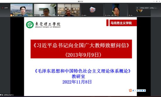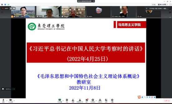 118日,《毛泽东思想和中国特色社会主义理论体系概论》教研室以线上形式组织第三次“强政治、强作风、强监管、强能力”专题学习会。本次“四强”专题学习重点围绕习近平总书记关于高校思想政治工作和教师工作的重要讲话精神、致信内容开展。学习会由教研室主任李仕波教授主持,蒋青青老师领学,教研室全体教师参加了学习。