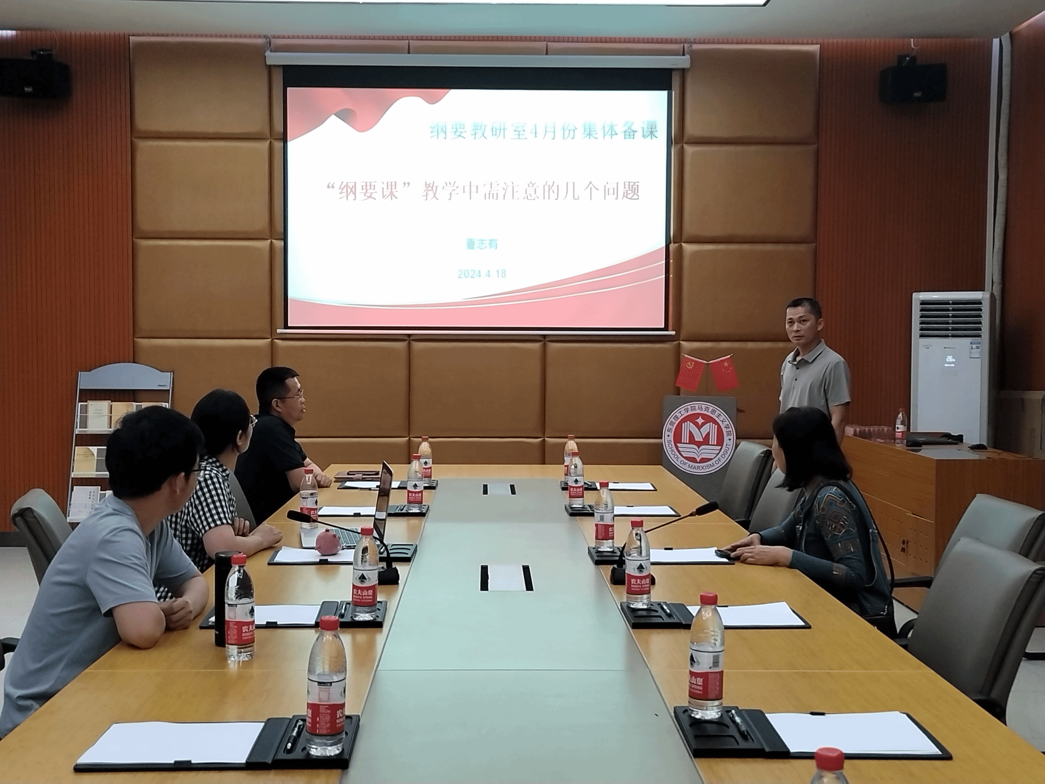 4月18日下午,“纲要”教研室在公司315会议室召开集体备课会。此次集体备课会由“纲要”教研室主任陈立中教授主持,夏志有副教授担任主讲,太阳城博彩党委书记、经理刘健研究员参加了本次备课会。