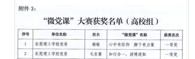 近日,东莞市委教育工委公布优秀主题党日等评选活动获奖名单,公司参赛作品在高校组中斩获佳绩。其中,获得党建工作创新案例一等奖1项和“微党课”大赛一等奖2项。